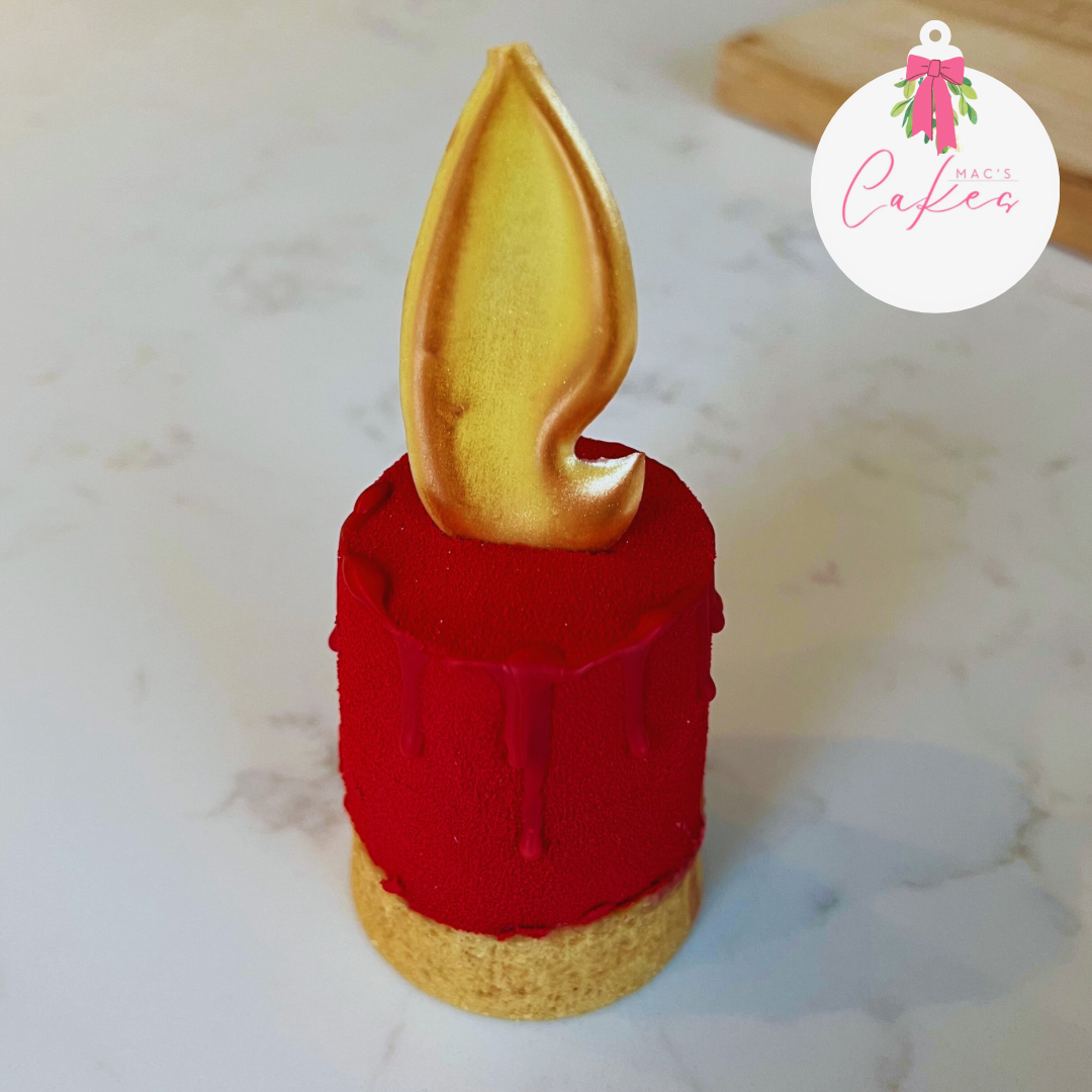 Een kaarsje van frambozenbavarois. Met chocolade ganache, een chocolade drip en een vlammetje van chocolade. Ietsje kleiner dan de gewone tartelettes, maar wel extra bijzonder.
