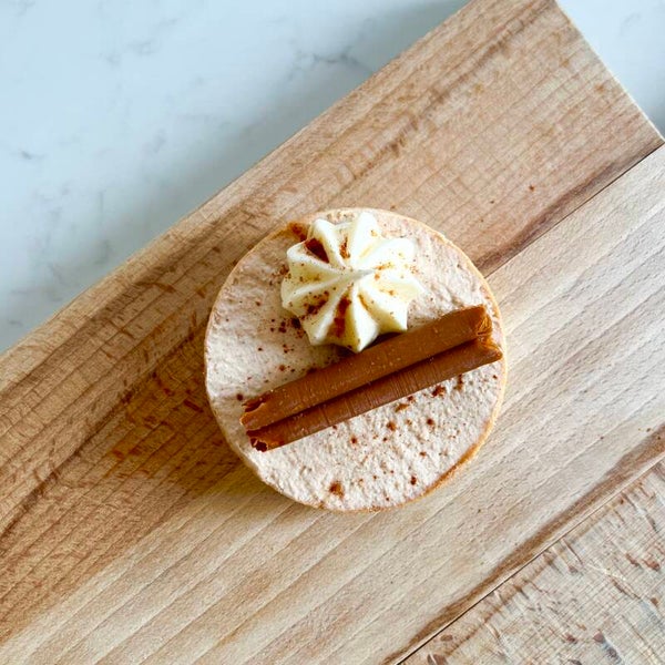 Mac’s versie van een appeltaartje. Gekarameliseerde appel met een crème van kaneel en een chocolade kaneelstokje.